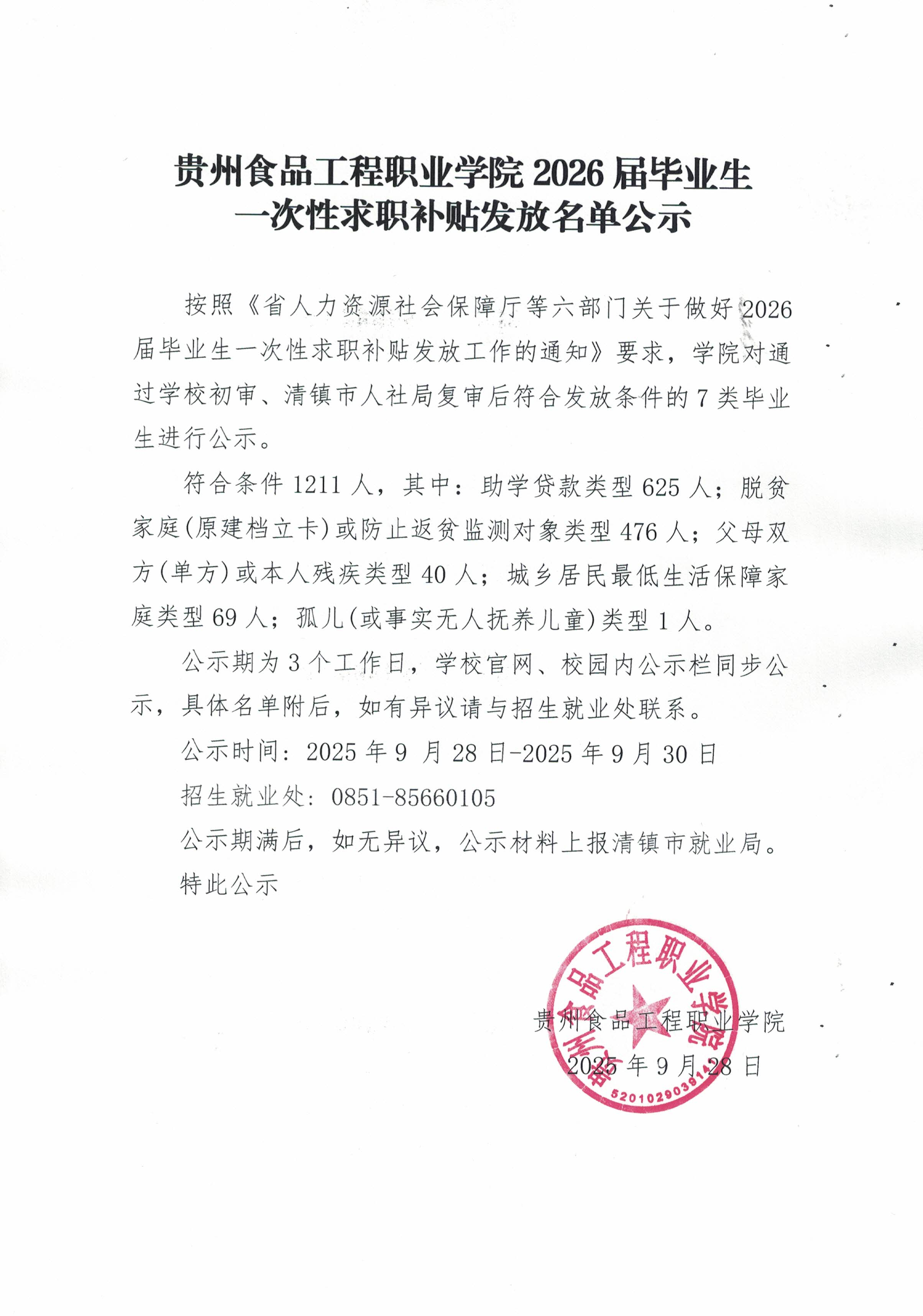 贵州食品工程职业学院2026届毕业生一次性求职补贴发放公示名单
